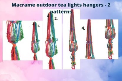 Macrame outdoor patio tea lights holder pattern, Boho rustic floral ceiling hangers, DIY macrame flower holders, LED tea lights glass holder
