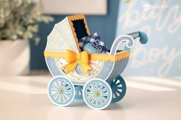 - Baby Carriage Keepsake SVG Size: 7.75” H X 11” W X 3.25” D
