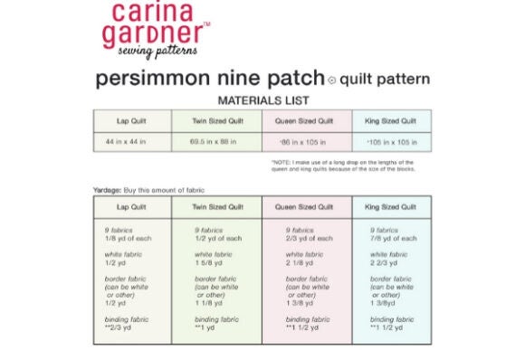 This pattern comes in the following sizes: Lap quilt, Twin quilt, Queen quilt, and King quilt. Check the second photo for yardage for these projects.